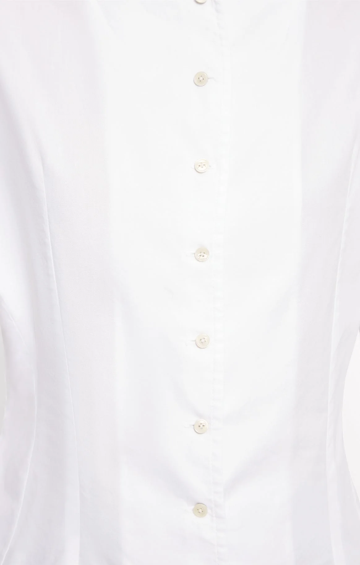 Cette chemise sans col en coton blanc incarne le thème Ralph. Sa coupe droite est structurée par une taille cintrée et appuyée, et ses manches ballons lui confèrent une allure féminine et élégante. Elle se ferme par une série de boutons discrets sur le devant.