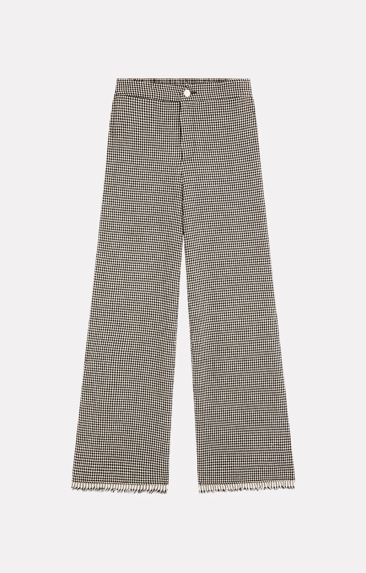 Ce pantalon taille haute présente une coupe droite 7/8, une fermeture zippée avec bouton ainsi qu'un bas de vêtement frangé