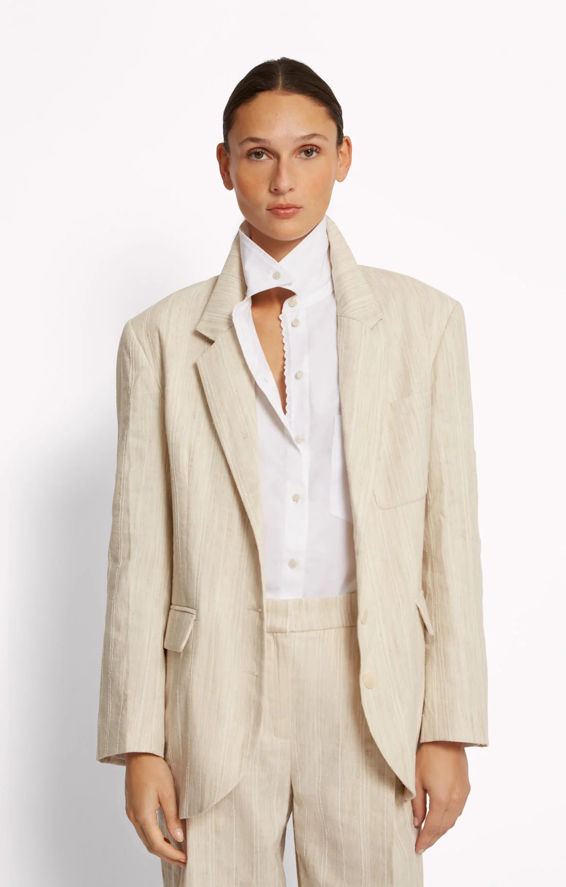 Cette gabardine tissée en Italie mêle coton, lin et polyester. Les rayures de ce thème tailoring en fil fantaisie apportent du relief à la matière, pour un rendu texturé au fini lavé.