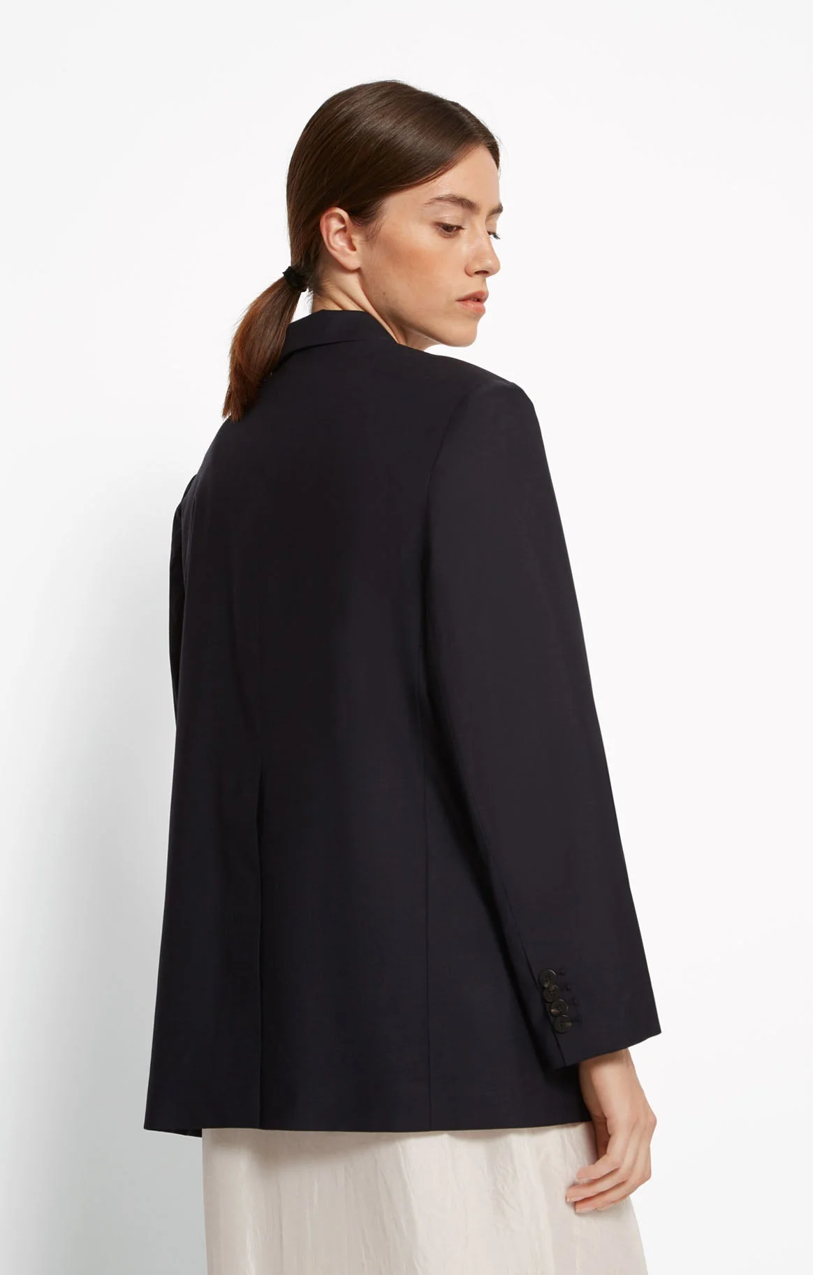 Veste tailleur à coupe droite, deux boutons devant, une poche poitrine plaquée ainsi que deux poches à rabat.